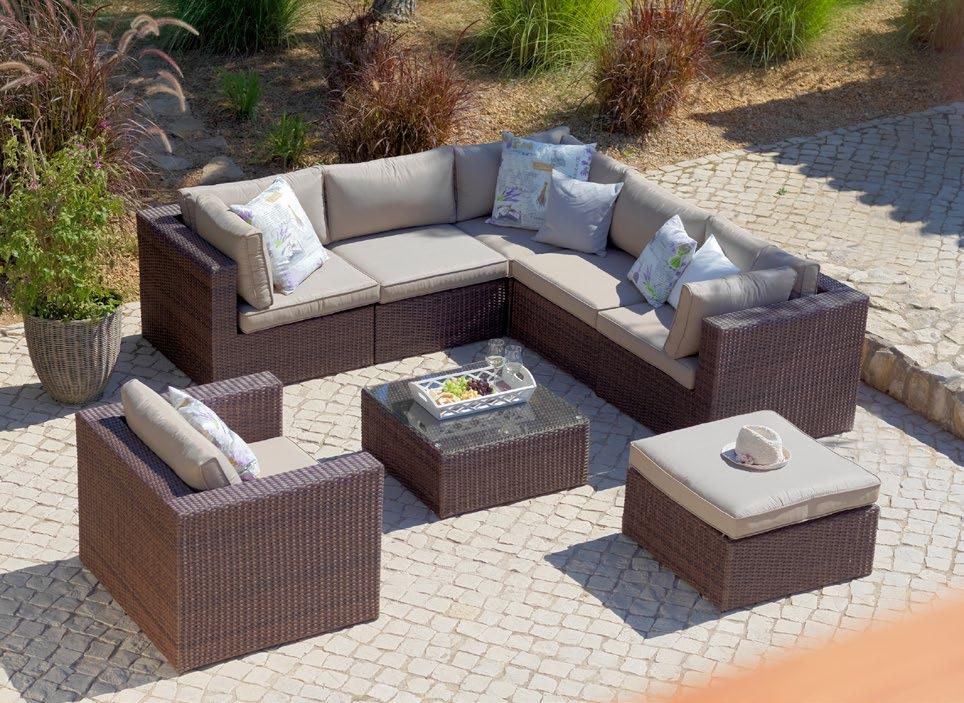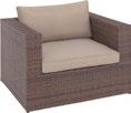 1: Luksuzna grarnitura Borneo chocolate, napravljena od metalnog rama i veštačkog pletiva, očarava svojim prirodnim i kvalitetnim izgledom. Sastoji se od troseda, dve fotelje sa jastucima i klupskog stola. Dodatne navlake za jastuke uključene u cenu i mogu se naizmenično menjati (22590010/19)