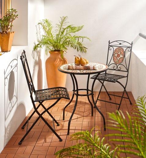 1: Balkonski set Wien sastoji se od dve sklopive baštenske stolice dim. 36x91x35 cm i stola od kovanog gvožđa u crnoj boji sa keramičkim mozaikom dim. 72x60 cm (05380002/09)