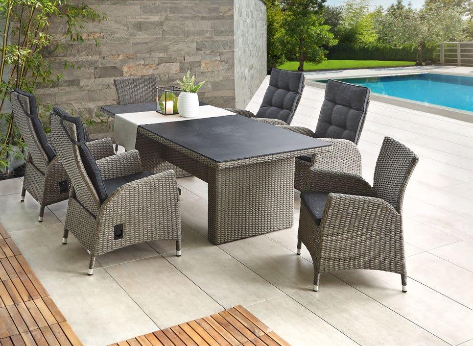 2: Baštenska garnitura San Leone za osećaj Mediterana na vašoj terasi... Raskošan 7-delni set oduševiće vas dizajnom i udobnošću. Aluminijska konstrukcija presvučena je prošaranim pvc pletivom u svetlo sivoj boji, a sastoji se od 6 fotelja dim.: 64,5x72x92 cm nosivosti do 120 kg i raskošnog stola s kaljenim staklom dim.: 200x74x100 cm nosivosti do 60 kg. Izgled upotpunjuju bogati jastuci za sedenje i naslon u svetlo sivoj boji (20040014/09)