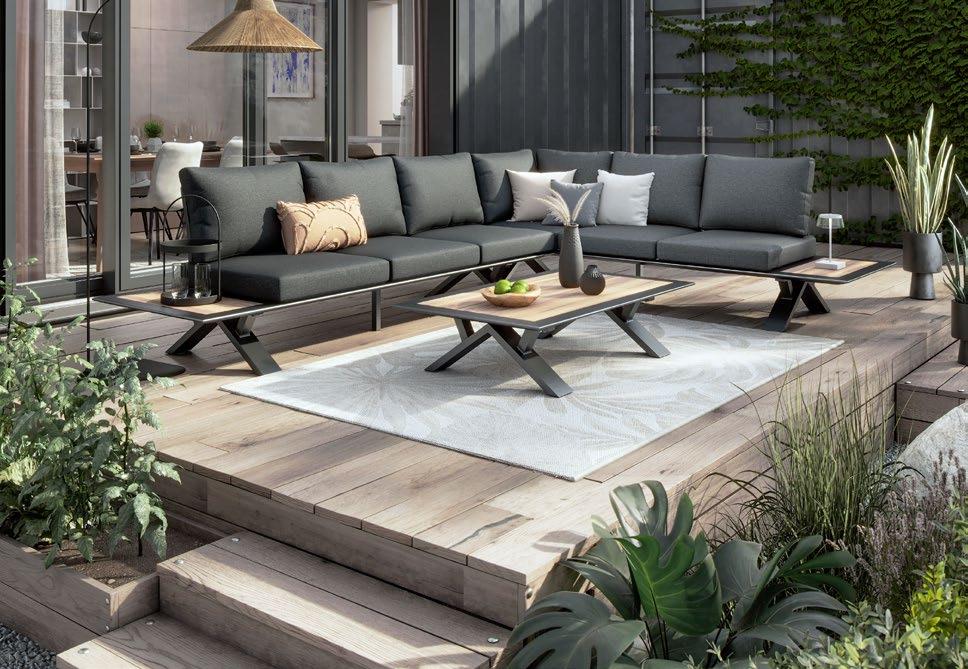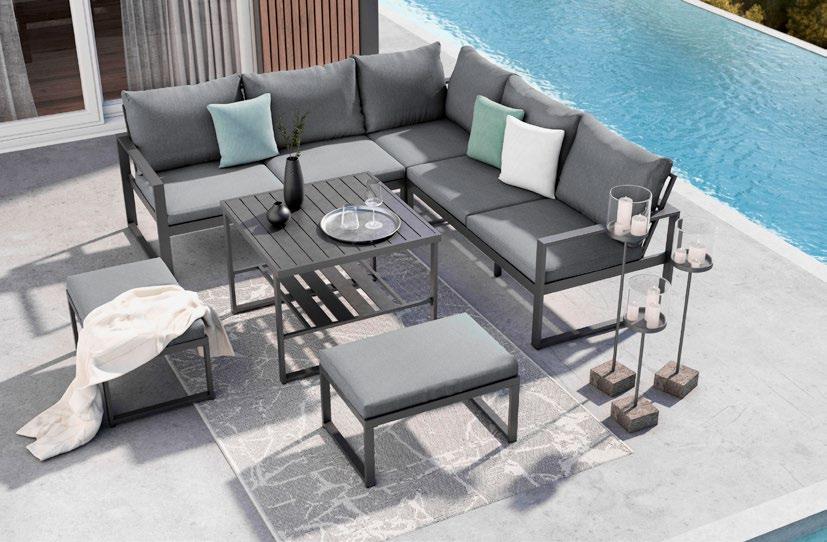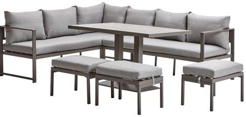 1: Lounge garnitura Como, aluminijumska konstrukcija zaštićena praškastim premazom u antracit boji. Sastoji se od: ugaone klupe dim. 238x80x238 cm, stola dim. 120x70x49 cm i 2 taburea dim. 74x42x50 cm. Sivi jastuci za sedenje i naslon uključeni su u cenu. Ukrasni jastučići dostupni uz doplatu (29050003/09)