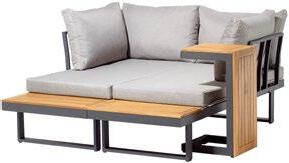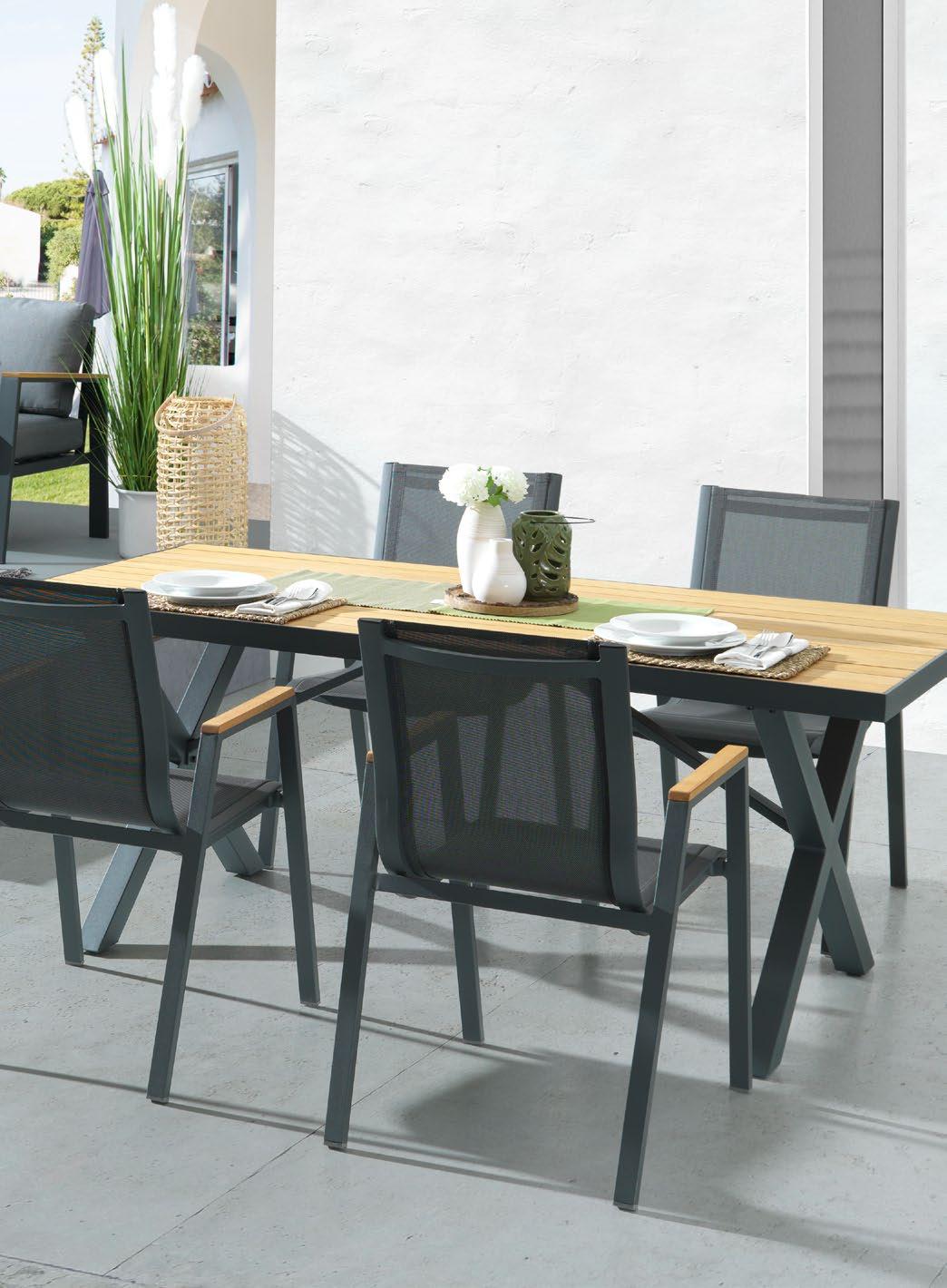2: Baštenska garnitura Mina pruža skladnu vezu modernog dizajna i prirodne lepote. Kombinacija kontrastnih materijala, aluminijumska konstrukcija zaštićena praškastim premazom u tamno sivoj boji u kombinaciji s pločama od masivnog drveta tikovine u natur boji uz luksuznu udobnost mekih jastuka za sedenje i naslon. Modularni sastav pruža mogućnost ugaone garniture ili dve odvojene klupe. Sastoji se od: stola dim. 120x30x70 cm nosivosti do 30 kg i 2 klupe dim. 232x73x74 cm nosivosti do 360 kg. U cenu je uključeno 6 jastuka za sedenje v. 10 cm i 7 jastuka za naslon v. 20 cm (00600015/09)