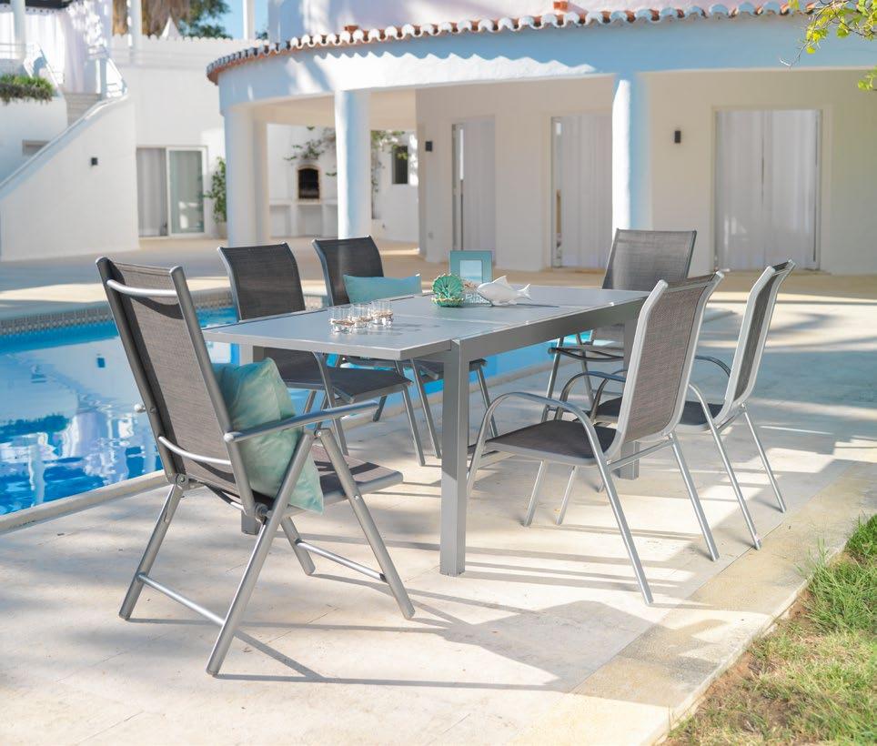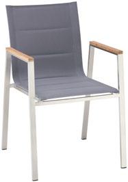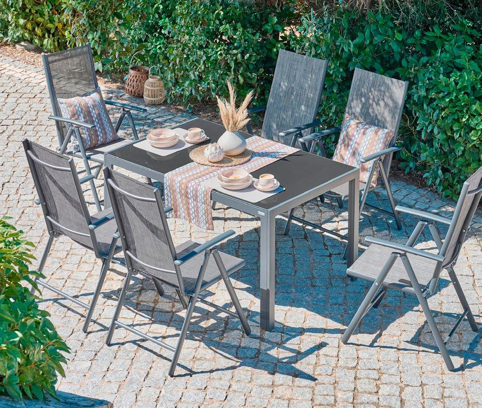 3: Baštenski sto Beja, boja: siva/ boja nerđajućeg čelika, materijal: metal/kaljeno mat staklo, maks. nosivost cca 60 kg, dim. 180x90x75 cm. Stolica Lugano, složiva, metalna konstrukcija, površina za sedenje 100% Textilene®, nasloni za ruke od tikovine, nosivost cca 120 kg, širina cca 54 cm (21060005/07; 0003/01)