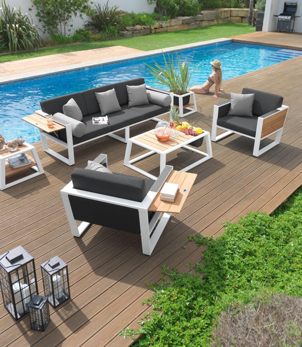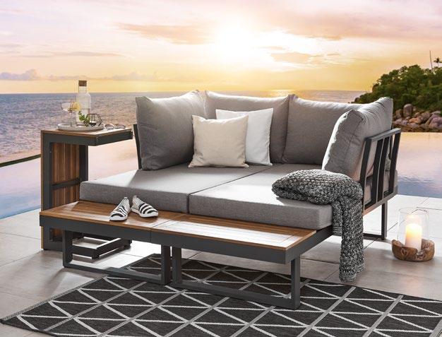 1: Baštenska garnitura Luanda - poseban izgled za posebne užitke! Postojana i snažna aluminijumska, geometrijska konstrukcija bele boje u kontrastu je sa crnim sedištem od tekstilen tkanine, postojanog na kiši. Strogoća garniture ublažena je sklopivim naslonima za ruke od pravog drveta tikovine koji zgodno služe i kao pomoćni stočići. Trosed dim. 220x61x81,5 cm nosivost do 250 kg. Fotelja dim. 84x61x81,5 cm nosivost do 150 kg. Jastuci za naslon, sedenje i sivi ukrasni jastuci uključeni u cenu. Sto dim. 75x41x110 cm nosivost do 50 kg. Održavanje: vlažno brisati, upotrebljavati sredstvo za održavanje drva, sušiti u hladovini, čistiti mekanom četkom. (29280008/02,07,13)