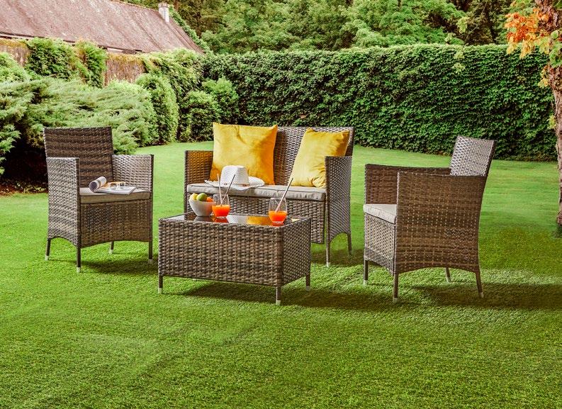 3: Baštenski set Runaway, metalni okvir presvučen PVC pletivom u boji meda. Sastoji se iz dvoseda/klupe dim. 132x81x68 cm nosivosti do 240 kg, stočića sa staklenom pločom dim. 108x40x71 cm nosivosti do 50 kg i dve fotelje dim. 75x81x68 cm nosivosti 120 kg. Izvlačni tabure ispod svake fotelje može poslužiti kao naslon za noge dok se sedište dvoseda podiže pa može služiti i kao sanduk za odlaganje. U cenu su uključeni jastuci za sedenje i leđa u boji peska. Dekorativni jastuci dostupni uz doplatu (16940026/09)