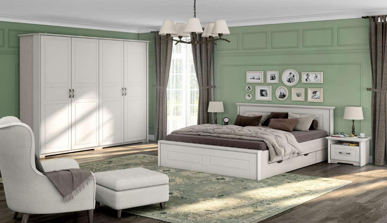 Spavaća soba Evergreen od medijapana u kombinaciji tople boje slonove kosti i dekora polarnog bora.