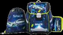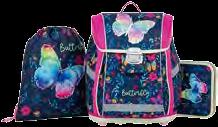 U motivima: leptir ili svemir, set sadrži: torbu, vrećicu za papuče i pernicu, torba ima podesivi remen i reflektirajuće dijelove. Više vrsta.