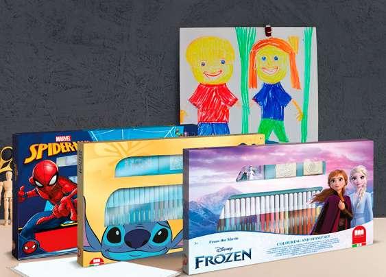 Sadrži 28 Giotto Turbocolor markera, 3 drvena i gumena pečata, 1 plavu tintu i knjigu za žig i bojanje. Teme: Spiderman, Frozen i Stitch.