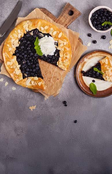 02 U zdjeli miješajte sir, žumanjak, šećer, ekstrakt vanilije i limunovu koricu dok ne nastane glatka smjesa. U sredinu svakog pravokutnika stavite po 1 - 2 žlice nadjeva, pazeći da ostane okvir od praznog dijela u rub tijesta. Po siru rasporedite borovnice pa pospite rubove listićima badema.