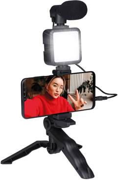 Selfie studio Grundig 3u1 s integriranim osvjetljenjem, mikrofonom i stativom, prenosiv i lagan, 9 pojedinačnih LED dioda, 3 podesive opcije svjetline, 3,5 mm, funkcija naginjanja 1 kom