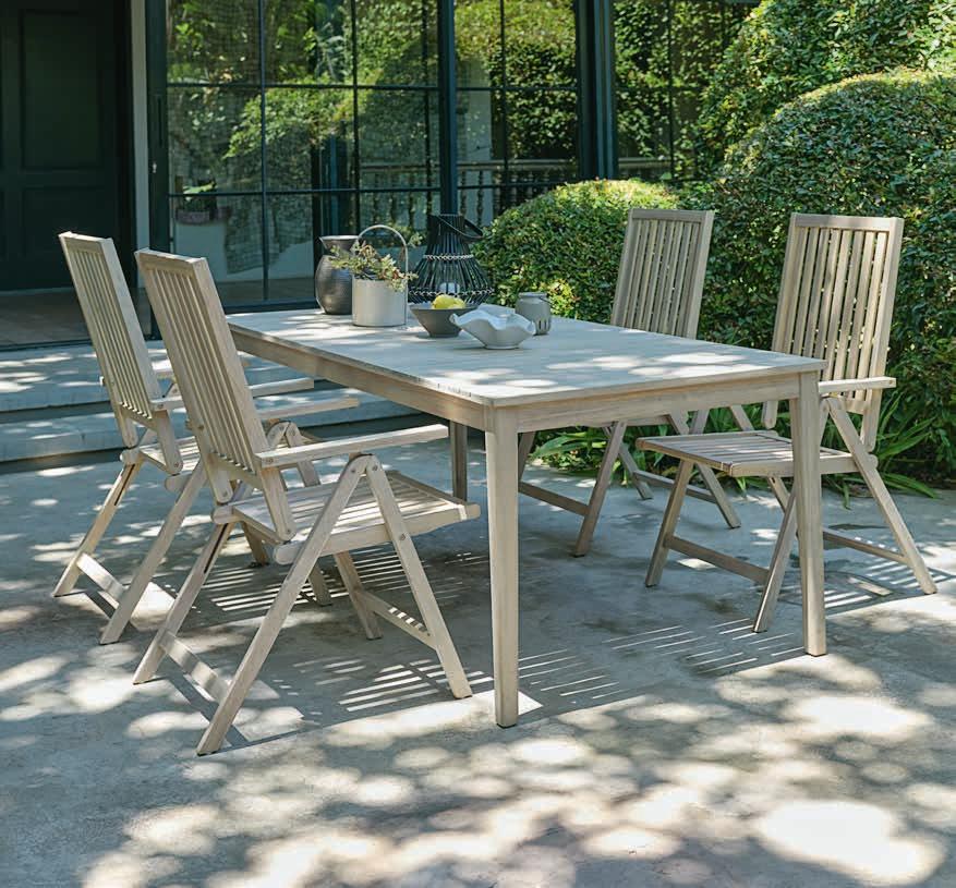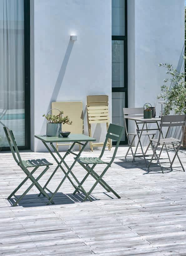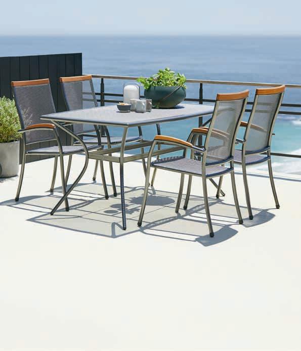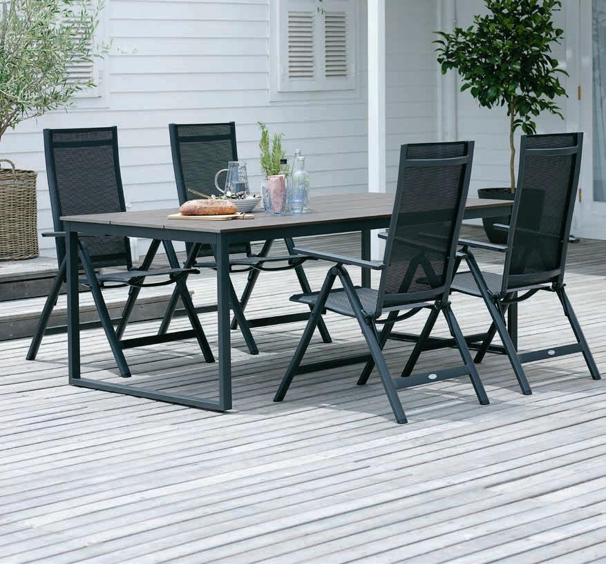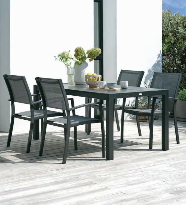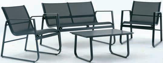 Stol: Aluminij, čelik i umjetno drvo. Š100xD210xV74 cm. Stolice: ČAluminij i tekstilen. Sa 6 položaja. Sklopive. Stol* 449 € 350€ Stolica 99 € 65€