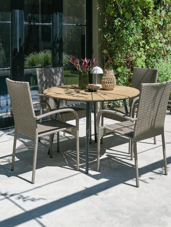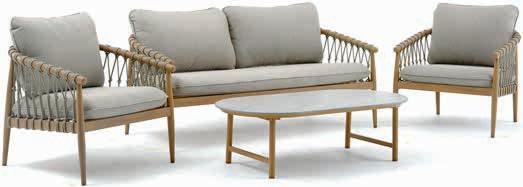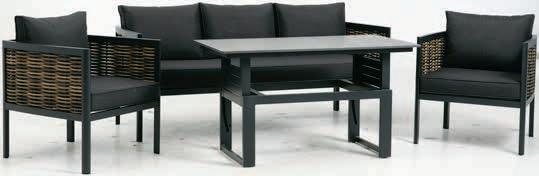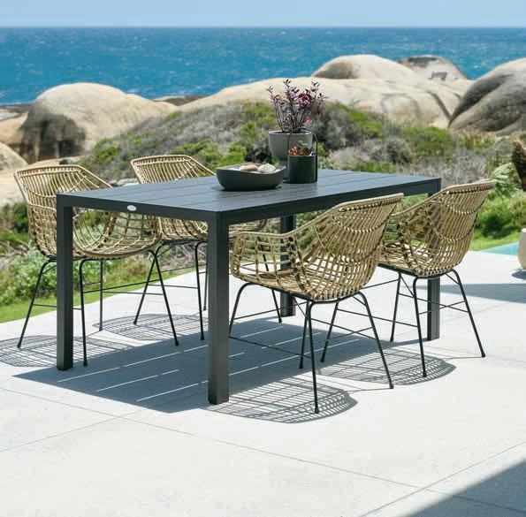 Stol: Aluminij i vlaknasti cement. Podesiva visina. Š65xD125xV44/68 cm. Trosjed i stolice: Aluminij i petan. S luksuznim jastucima s grubo tkanom navlakom koja se brzo suši.* 1699 €