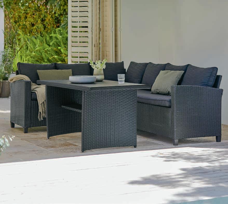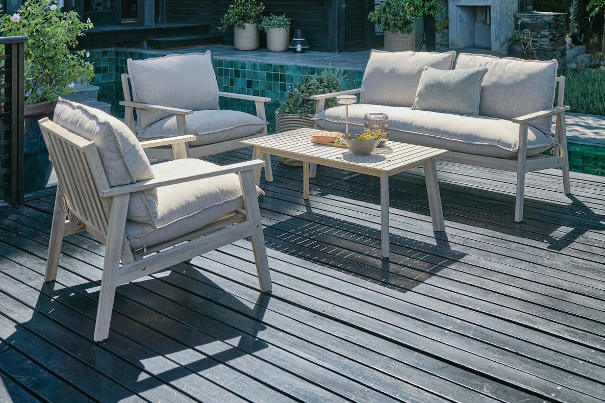 Stol: Nauljeno FSC® tvrdo drvo. Š55xD100xV41 cm. Produženi dvosjed i stolice: Nauljeno FSC® tvrdo drvo. S luksuznim jastucima s dugotrajnom, grubo tkanom navlakom. 799 € 600 €