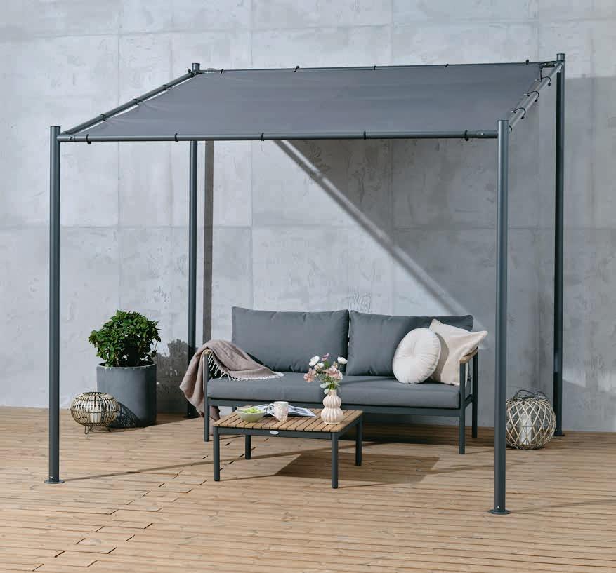Čelični okvir i vodoodbojno**** platno od poliesterskih vlakana. Postavite ga samostalno, uza zid ili kombinirajte dva paviljona da biste pokrili veću površinu. Hidrostatički stup: 1000 mm. Težina: 23 kg. Š2,5xD2,5xV2,5 m* 199 €