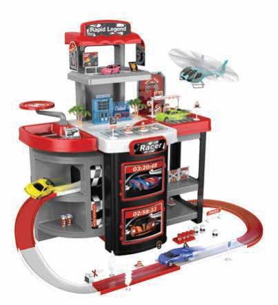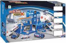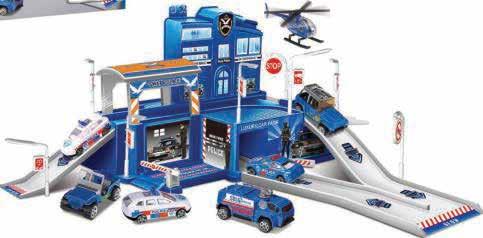 Sadrži 5 zanimljivih vozila: 2 automobila za brzu intervenciju, helikopter za vazdušni nadzor i 2 autobusa za prevoz osumnjičenih. Komplet uključuje saobraćajne znakove, rampe i prepreke, obogaćujući igru.