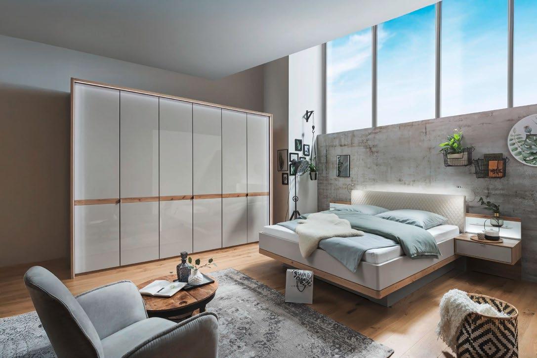Spavaća soba Barcelona , boja: beli hrast/šampanj staklo, 6-krilni ormar, dim. 300x236x58 cm; ram kreveta sa tapaciranim uzglavljem i 2 noćna ormarića dim. 309x97x215 cm, sa ležajem dim. 180x200 cm. Rasveta, paspartu za ormar, paneli za noćne ormariće, letvice, dušek i veliki izbor dodatne opreme dostupni uz doplatu (04420219/01,17,10)