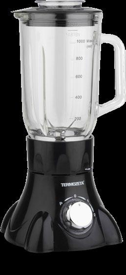 Staklena čaša od 1 litre, sigurnosni sustav, 2 brzine + "Pulse" funkcija, uklonjive oštrice od nehrđajućeg čelika, poklopac vrča s rupom za ubacivanje hrane, mjerna kapica koja se može skidati, nožice koje se ne kližu, snaga: 300/400 W.