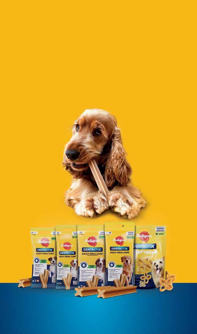 PEDIGREE® DENTASTIX™ štapići za svakodnevnu oralnu higijenu naučno dokazano čiste zube i štite desni vašeg psa. Razvijeni su u saradnji sa veterinarima, sadrže malo masti, bez dodatog šećera, veštačkih boja i aroma.