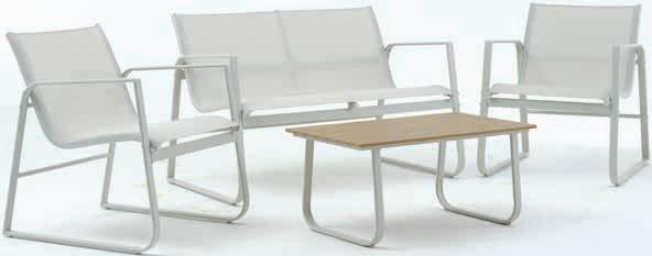 Stolovi: Aluminij i nauljeno FSC® tvrdo drvo. Š72/62xD72/62xV39/32 cm. Produženi dvosjed i stolice: Aluminij i nauljeno FSC® tvrdo drvo. S luksuznim jastucima s dugotrajanom grubo tkanom navlakom