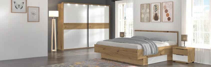 Spavaća soba OSLO: krevet, 160x200cm + ormar, 215x225x60cm + 2x noćni ormarić, 45x46x40cm, boja hrast/bijela. Ukrasni okvir i stoperi nisu uključeni u cijenu.