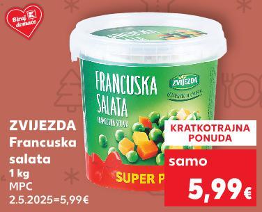 *Sve navedene cijene izražene su u eurima s PDV-om. Ne odgovaramo za tiskarske pogreške. Fotografije proizvoda ne moraju 100% odgovarati dotičnim proizvodima. Proizvode iz aktualne ponude možete kupiti samo u količinama predviđenim za kućanstvo. **Pojedini proizvodi označeni kao kratkotrajna ponuda dostupni su količinski i vremenski strogo ograničeno, te je za istima u pravilu potražnja povećana. Stoga upućujemo naše cijenjene kupce da je sve detalje oko istih moguće dobiti na našem info-pultu izravno, ili pak unaprijed putem Upravljanja odnosa s kupcima, na broj 0800/223 223 ili putem e.maila kontakt@kaufland.hr MPC=maloprodajna cijena u smislu čl. 4. st. 1. t. 11. Zakona o zaštiti potrošača (NN 19/22, 59/23) 0800 / 223 223 (besplatni telefon Upravljanja odnosa s kupcima) Radno vrijeme Upravljanja odnosa s kupcima: pon - pet, od 8:00 do 20:00 / sub od 8:00 do 17:00