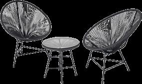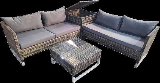 4-dijelna, sadrži stolić 62×62×33cm, (5mm kaljeno staklo), 2 dvosjeda 135×69×63cm, kutiju za pohranu 69×69×63cm, 4 jastuka 63×60×7cm, 4 jastuka za na slon 37×63×14cm Čelični okvir prekriven umjetnim ratanom