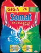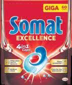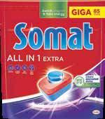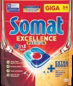 Tablete za strojno pranje posuđa Somat 5u1 54 kom (1 kom=0,27€), Excellence 60 kom (1kom= 0,24€), Gold 70 kom (1kom=0,21EUR), All in One Extra 85 kom (1kom=0,18€), Gel za strojno pranje posuđa Somat 1370ml (1l=10,58€)