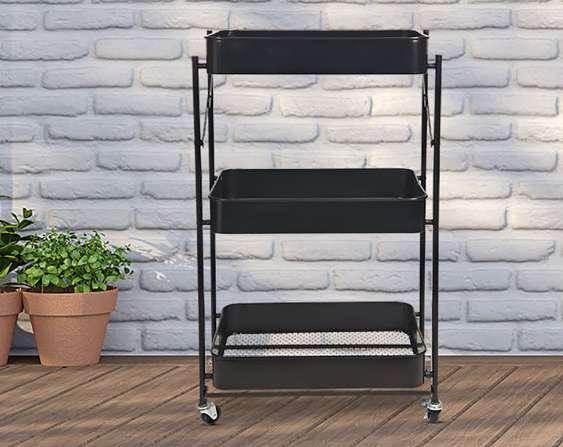 Izrađena od metala, sa 4 kotača, 3 police, sklopiva, dimenzija 52 x 29 x 82h cm, crne boje.