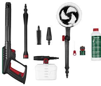 Uključujući: standardna mlaznica, turbo mlaznica za prljavštinu, rotirajuća četka za pranje, mlaznica za pjenu (1 l), 10 m visokotlačnog crijeva, 500 ml sredstva za čišćenje
