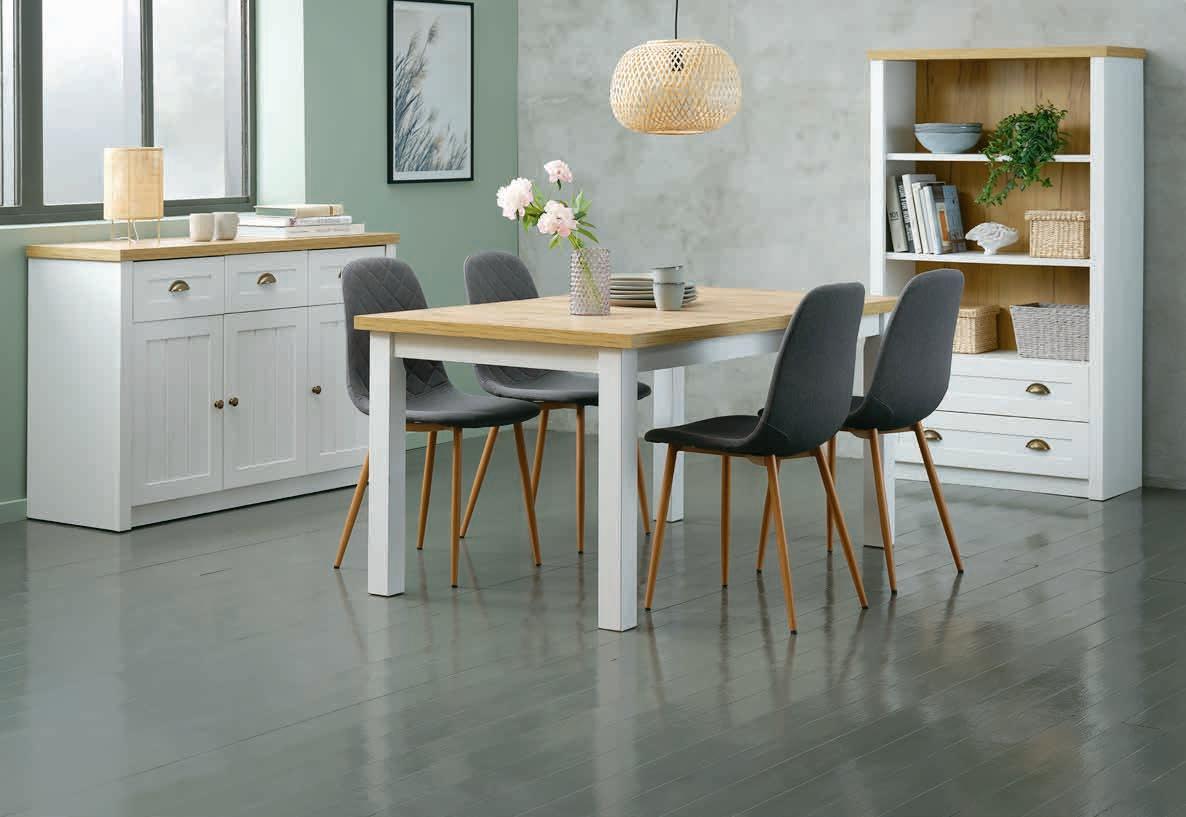 Stol: Ukrasni furnir. S 1 dodatnim krilom koje se može spremiti ispod gornje površine stola. Š90xD150/193xV75 cm. Stolice: Tkanina i čelik. Stol* 429 € 275€ Stolica 49,99 € 35€