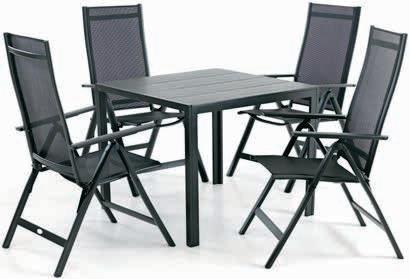 Stol: Aluminij i umjetno drvo. Š90xD90xV74 cm. Stolice: Aluminij i tekstilen. Sa 6 položaja. Sklopive. Stol 129 € 100€ Stolica 99 € 65€
