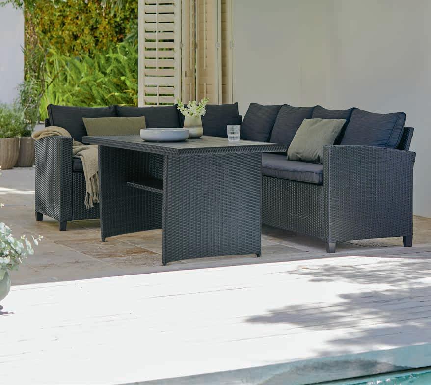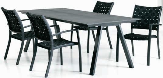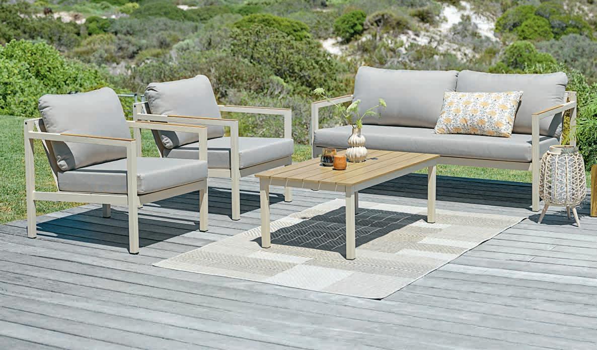 Stol: Aluminij i vlaknasti cement. Podesiva visina. Š65xD125xV44/68 cm. Trosjed i stolice: Aluminij i petan. S luksuznim jastucima s grubo tkanom navlakom koja se brzo suši.* 1699 €