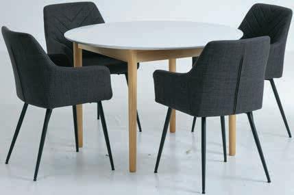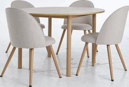 Stol: Masivno drvo i medijapan. Ø110xV75 cm. S 2 dodatna krila. Veličina kada se produži Š110xD200xV75 cm. Stolice: Tkanina i čelik. Stol* 399 € 275€ Stolica 84,99 € 55€