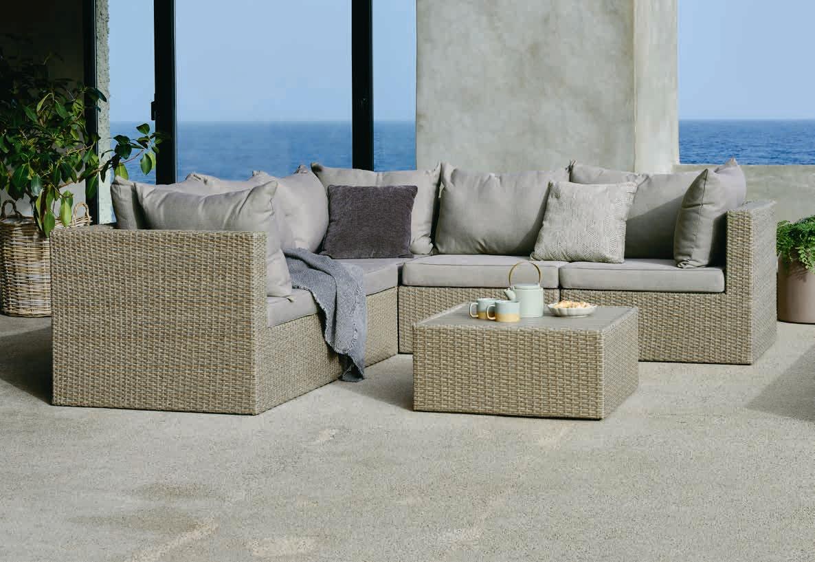 Modularna vrtna garnitura uključuje 6 modula koji se mogu prilagoditi vašem vanjskom prostoru. 1 stol: Čelik, umjetno drvo i petan. Š70xD70xV32 cm. 2 centralna i 3 kutna/kranja modula: Čelik i petan. S luksuznim jastucima s dugotrajnom, gusto tkanom navlakom.* 1444