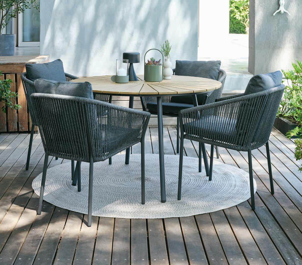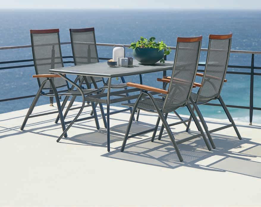 Stol: Aluminij i čelik. S Durasint® premazom za zaštitu od hrđanja. Š90xD150xV74 cm. Stolice: Aluminij, čelik i nauljeno FSC® tvrdo drvo. S Durasint® premazom za zaštitu od hrđanja. 5 položaja. Sklopive. Stol 349 € 200€ Stolica 179 € 110€