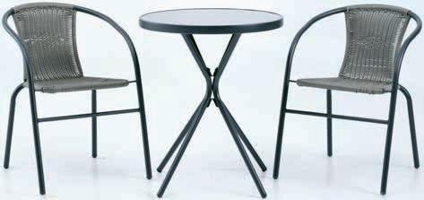 Stol. Čelik i kaljeno staklo. Ø60xV70 cm. Stolice: Čelik i petan. Mogu se slagati jedna na drugu. Stol 27,50€ Stolica 20€