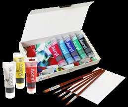 S finom akrilnom bojom u tubi od 75 ml, 8 boja, 1 platnena kartica 18 x 24 cm, 5 kistova: okrugli 5, 8; ploča 6, 10, 18.