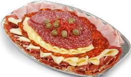 SADRŽI: buđola 100 g, masline crne pečene 50 g, salama panona s paprikom 100 g, salama zimska 80 g, šunka kuhana 120 g, šunka suha 120 g, sir caprodur 150 g, sir trapist 150 g