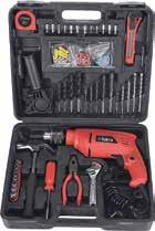 Svrdlo: Ø13mm, Promjenjiva brzina, Dva smjera vrtnje, Dodatna ručka, Priloženi alati: stolarski čekić, kombinirana kliješta, podesiva kliješta, magnetni nastavak, tapetarski nož, mjerna traka, set nasadnih ključeva, set 25mm nastavaka, set za bušenje, vijci s tiplom