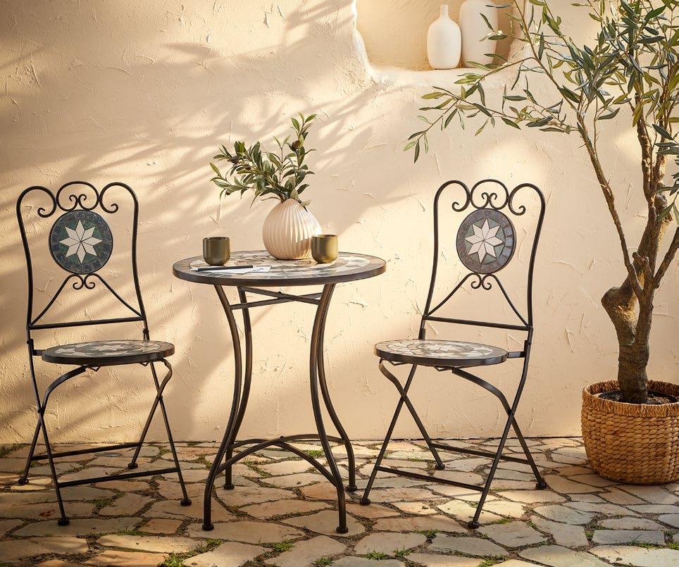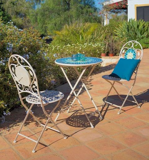 1: Balkonski set Wien sastoji se od dve sklopive baštenske stolice dim. 36x91x35 cm i stola od kovanog gvožđa u crnoj boji sa keramičkim mozaikom dim. 72x60 cm (05380002/09)