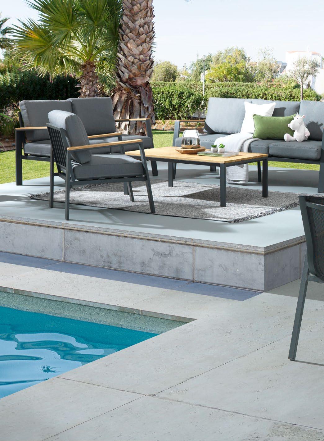 2: Baštenska garnitura Mina pruža skladnu vezu modernog dizajna i prirodne lepote. Kombinacija kontrastnih materijala, aluminijumska konstrukcija zaštićena praškastim premazom u tamno sivoj boji u kombinaciji s pločama od masivnog drveta tikovine u natur boji uz luksuznu udobnost mekih jastuka za sedenje i naslon. Modularni sastav pruža mogućnost ugaone garniture ili dve odvojene klupe. Sastoji se od: stola dim. 120x30x70 cm nosivosti do 30 kg i 2 klupe dim. 232x73x74 cm nosivosti do 360 kg. U cenu je uključeno 6 jastuka za sedenje v. 10 cm i 7 jastuka za naslon v. 20 cm (00600015/09)