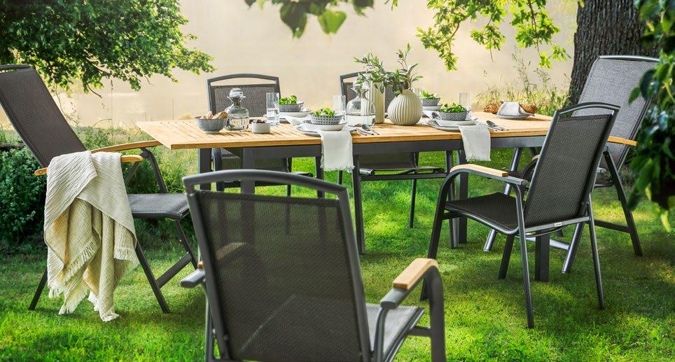 3: Baštenski sto Beja, boja: siva/ boja nerđajućeg čelika, materijal: metal/kaljeno mat staklo, maks. nosivost cca 60 kg, dim. 180x90x75 cm. Stolica Lugano, složiva, metalna konstrukcija, površina za sedenje 100% Textilene®, nasloni za ruke od tikovine, nosivost cca 120 kg, širina cca 54 cm (21060005/07; 0003/01)