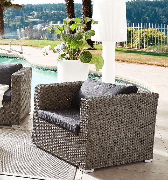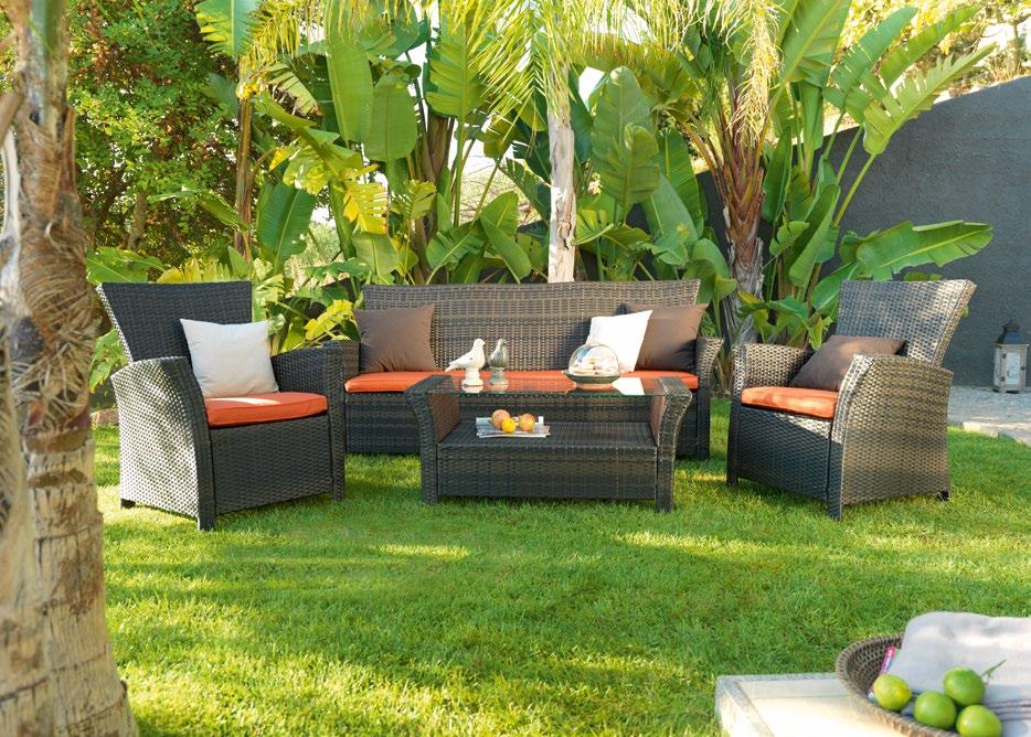 1: Luksuzna grarnitura Borneo chocolate, napravljena od metalnog rama i veštačkog pletiva, očarava svojim prirodnim i kvalitetnim izgledom. Sastoji se od troseda, dve fotelje sa jastucima i klupskog stola. Dodatne navlake za jastuke uključene u cenu i mogu se naizmenično menjati (22590010/19)