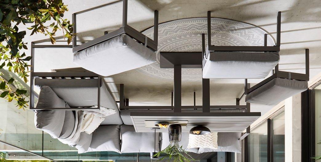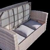 3: Baštenski set Runaway, metalni okvir presvučen PVC pletivom u boji meda. Sastoji se iz dvoseda/klupe dim. 132x81x68 cm nosivosti do 240 kg, stočića sa staklenom pločom dim. 108x40x71 cm nosivosti do 50 kg i dve fotelje dim. 75x81x68 cm nosivosti 120 kg. Izvlačni tabure ispod svake fotelje može poslužiti kao naslon za noge dok se sedište dvoseda podiže pa može služiti i kao sanduk za odlaganje. U cenu su uključeni jastuci za sedenje i leđa u boji peska. Dekorativni jastuci dostupni uz doplatu (16940026/09)