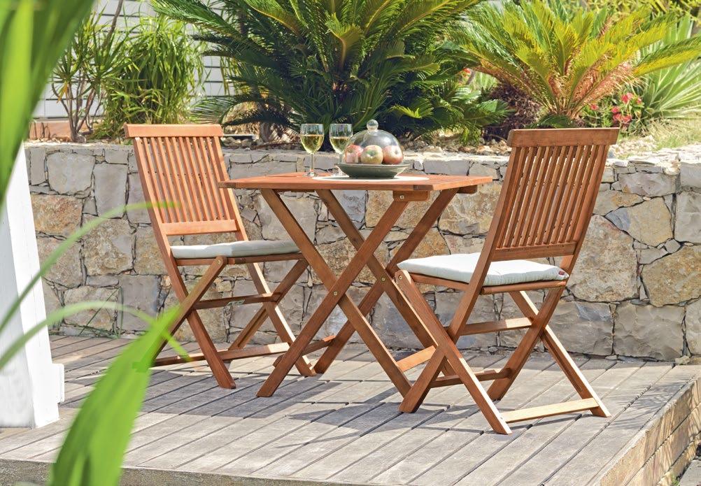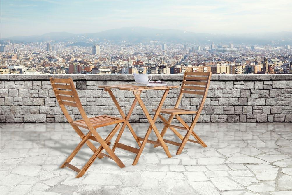 2: Baštenski set HHC+TVT od masivnog, punog drveta akacije, u prirodnoj, natur boji. Sastoji se od stola dim. 60x74x60 cm nosivosti do 50 kg i dve stolice dim. 41x86x55 cm nosivosti do 100 kg (27500026/01)