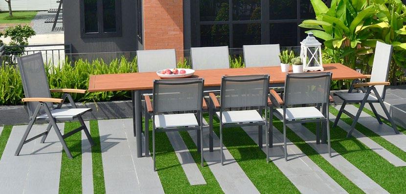 1: Stolica Plano, složiva, boja: antracit siva, alu-okvir, plastificirani rukonasloni, nosivost do 130 kg. Baštenska stolica Plano, sklopiva dim. 63 x 116 x 60 cm. Baštenski sto Plano, dim. 150 x 74 x 90 cm, sa mogućnošću razvlačenja do 210 cm (20530001/01,02,07)