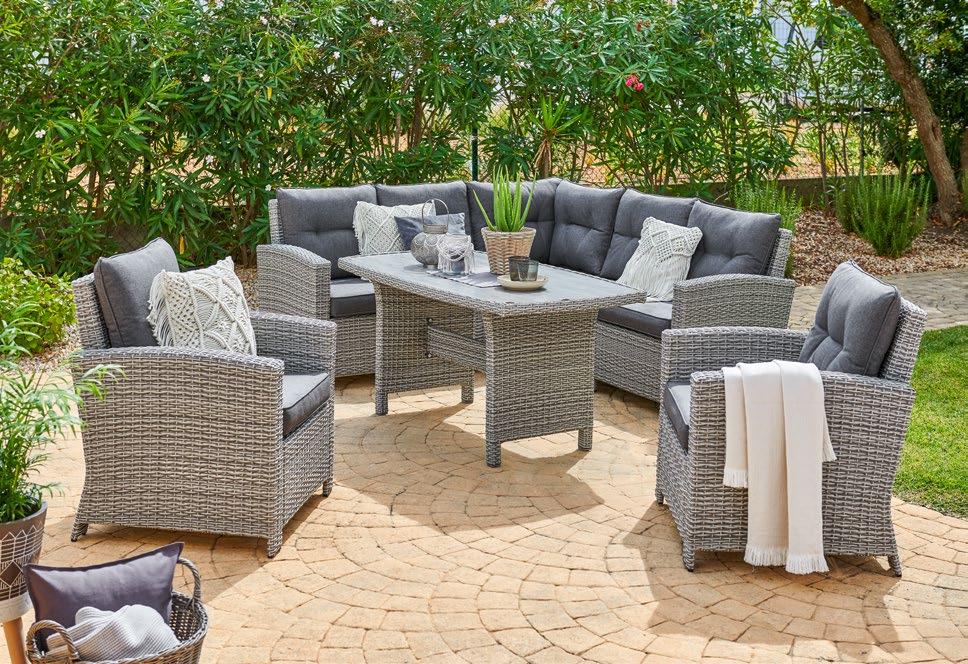 Baštenska garnitura Tahiti, aluminijum/ plastično pletivo/poliester, boja: siva, nosivost do 120 kg. Fotelja za sedenje, 77x82x75 cm. Ugaoni deo za sedenje, 75x83x75 cm. Završni deo za sedenje, desni, 65x82x75 cm. Zavšni deo za sedenje, levi, 65x82x75 cm. Srednji deo za sedenje, 55x82x75 cm. Sto, sa staklom, maks. opterećenje do 60 kg, 150x80x67 cm (08730016/01-05,07, 08730010/01)