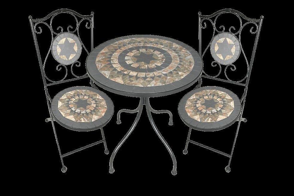 kvalitetan okvir izrađen od presvučenog čelika u kombinaciji s mozaik pločicama daje trodijelnom kompletu, koji se sastoji od stola i 2 stolice, jedinstveni izgled, sklopivo i jednostavno za pohranu, dimenzije stola: Ø 60, visina 71 cm, dimenzije stolice: Ø 38, visina 91 cm 1 set