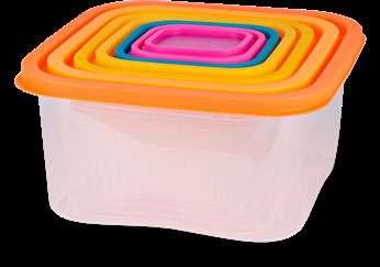 Posude različitih boja s hermetičkim poklopcima, prikladne za: zamrzivač, mikrovalnu pećnicu i perilicu posuđa.