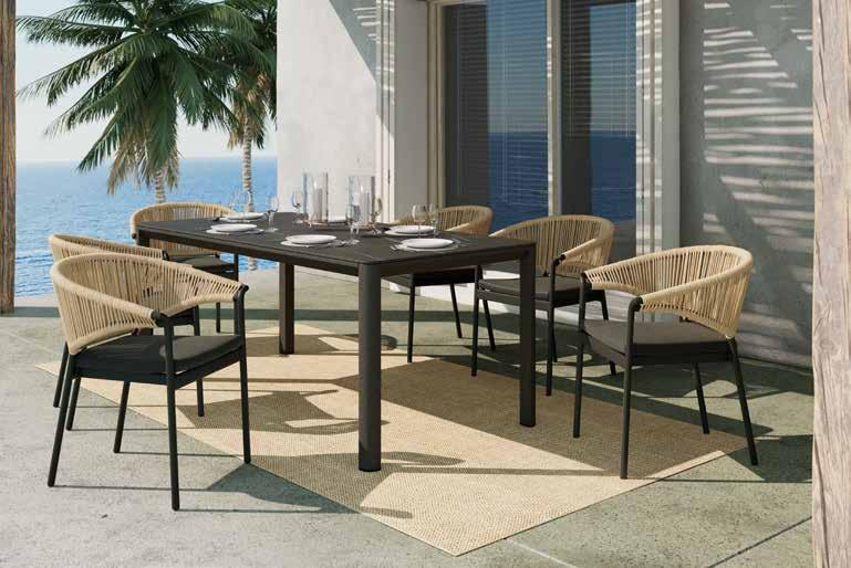 Vrtni set, aluminijska konstrukcija zaštićena praškastim premazom u antracit boji. Stol Sato, s pločom od sinteriranog kamena, razvlačni,cca š/v/d: 200-300x76x100 cm, nosivosti do 60 kg. Vrtna stolica Circle, okretno postolje, naslon za leđa i ruke od užadi u bež, zelenoj ili sivoj boji, cca š/v/d: 56x78,5x62,5 cm, nosivosti do 140 kg. (00690166/07;04560003/01,11,21)