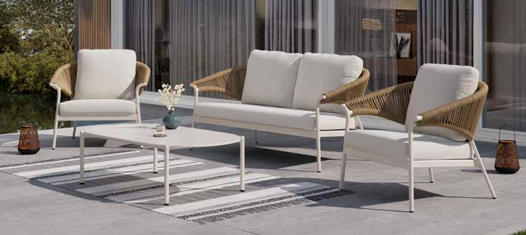 Lounge garnitura Entera, lijevi ili desni kut, aluminijska konstrukcija zaštićena praškastim premazom u boji pijeska. Sastav: dva stola, cca š/v/d: 73x25x73 cm, nosivosti do 30 kg, cca š/v/d: 36x25x73 cm, nosivosti do 20 kg; dvije klupe, cca š/v/d: 133x69x83 cm, nosivosti do 240 kg; srednji dio, cca š/v/d: 73x69x83 cm, nosivosti do 120 kg. Lounge fotelja Entera, s jastucima za sjedenje i naslon i dva ukrasna jastučića, cca š/v/d: 83x69x93 cm, nosivosti do 120 kg. (18070022/09,29,01)